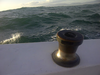 At some point I began to notice that the waves were coming from behind instead of aiming themselves at our bow. I'm not exactly sure when this happened, as I was feeling very worn and fatigued after an hour an a half of all of this. I almost didn't care anymore as I was beginning to lose it. But at least I still held on and aimed the boat in the right direction. Suddenly I looked behind and noticed a huge breaking white wave looming up behind me. I knew that if it caught up with us it would swamp the cockpit and tons of water would enter the boat. Already half a foot of water was in the cockpit floor, flowing back in forth with the motion of the boat (the water was half mixed with gasoline too - as the smell was horribly present. Hours ago Brad and I had tried to figure our where the gas was leaking from. The gas tank was clearly closed - so it was a bit of a mystery really). But that was the least of our problems. Thankfully the hatches were all closed and most of the water would not get in. But still I was fearful. I tried my best to aim away from the wave that was looming from behind but it followed us like a guided missile and soon the boat rose up to its ugly white head. As soon as I expected the horrible drenching, suddenly the boat's stern rose right up on the white water - hardly letting an inch of water come in!